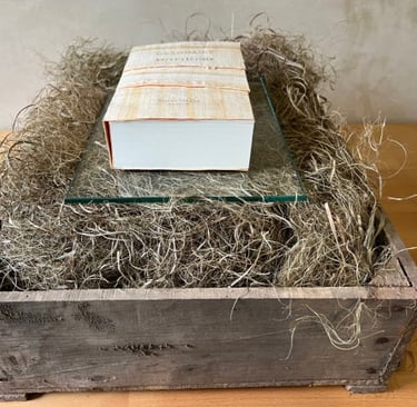 Présenté sur vitre sur tapis de chanvre dans une caisse en bois rappelant les transports des antiquités égyptiennes vers les musées occidentaux