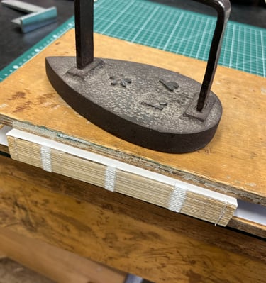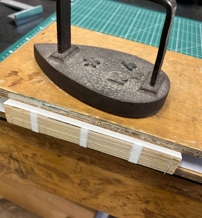 Reliure : couture en nid d’abeille par fils de lin sur rubans d’intissé